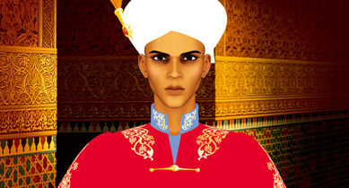 In effetti, non si dispone di alcun documento magrebino-andaluso, a parte alcune eccezioni che si contano sulla punta delle dita. Vi si ritraggono dei sultani vestiti con il costume tradizionale conosciuto, burnus e turbante. Sembra che nulla sia cambiato. Gli abiti tradizionali femminili di oggi evocano ancora quelli dei tempi dei romani: sono dei tessuti drappeggiati e fermati con delle fibule. Ho utilizzato questi indumenti, con un abbondanza di ornamenti berberi. I costumi dei due eroi, al contrario, dovevano avere un aspetto fiabesco. Li ho presi nella civiltà persiana, più precisamente dal XVI secolo (Damasco, Bagdad, l’Iran, avevano continuato l’arte delle immagini). È un imbroglio rispetto all’epoca, poiché la storia si svolge nel medio evo. L’imbroglio rispetto al luogo è minore, lo giustifico con la potenza di Jénane, diventata una grande commerciante. Le sue navi e le sue carovane percorrono in lungo e in largo una parte del globo, e può offrire a suo figlio l’ultima moda d’Ispahan. La cosa più importante, è che sia bello!